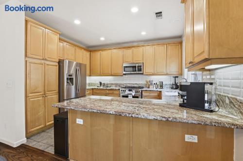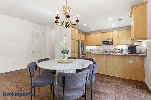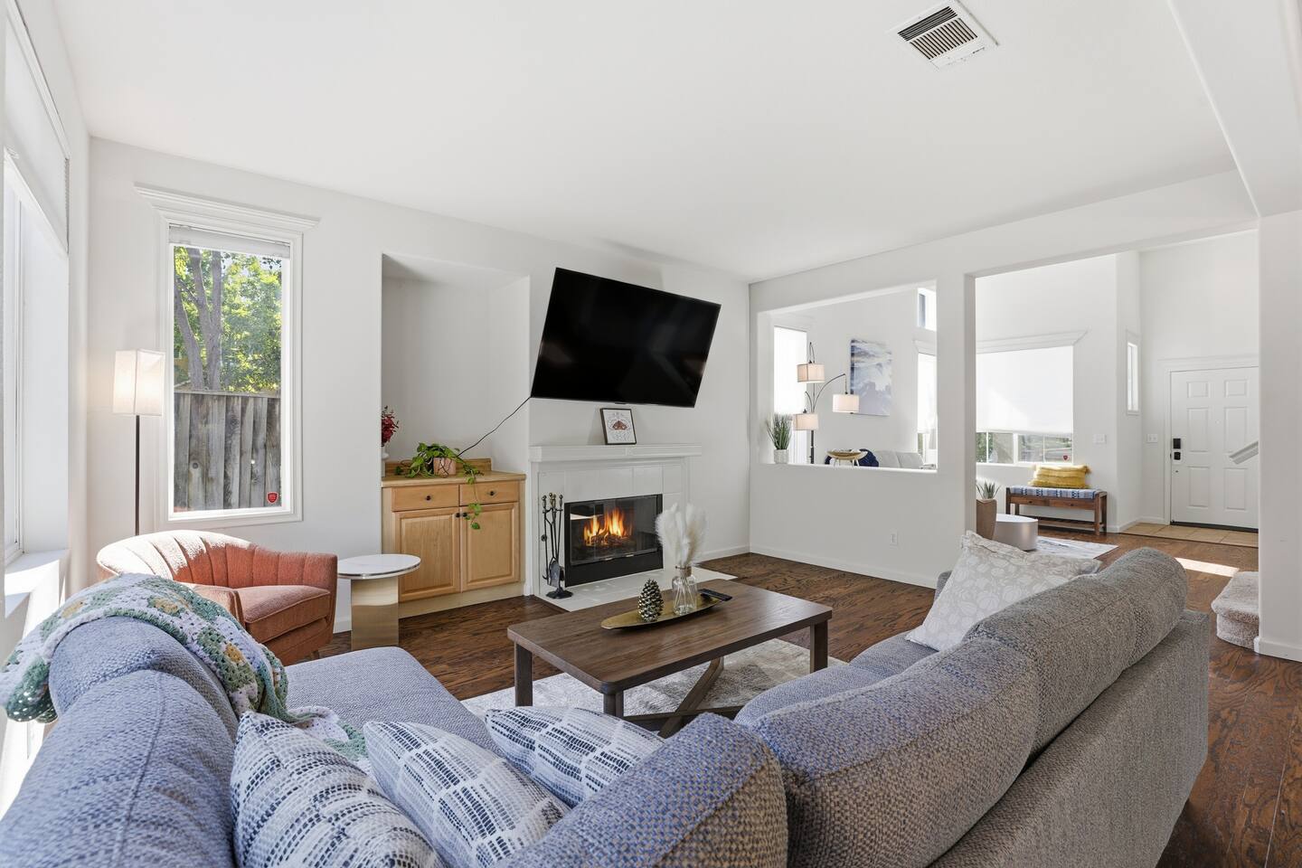 🏡 The Space Step inside to a spacious open-concept living area filled with natural light and modern touches. Relax on the plush sofa, stream your favorite shows on the 75 inch Smart TV, or gather around the dining table for shared meals. The fully equipped kitchen has everything you need — cookware, utensils, a coffee maker, and more — to feel right at home. Upstairs, three comfortable bedrooms await: 🛏 Master Bedroom: King bed, walk-in closet, and ensuite bathroom 🛏 Bedroom 2 & 3 : Queen beds with soft linens Loft on 2nd floor: Sofabed and work station All bathrooms are stocked with fresh towels, toiletries, and hair dryers. 🌳 Outdoor & Amenities Private backyard patio for morning coffee or evening relaxation In-unit washer & dryer for your convenience Two-car garage + driveway parking High-speed WiFi throughout 2 Zone Central A/C & heating